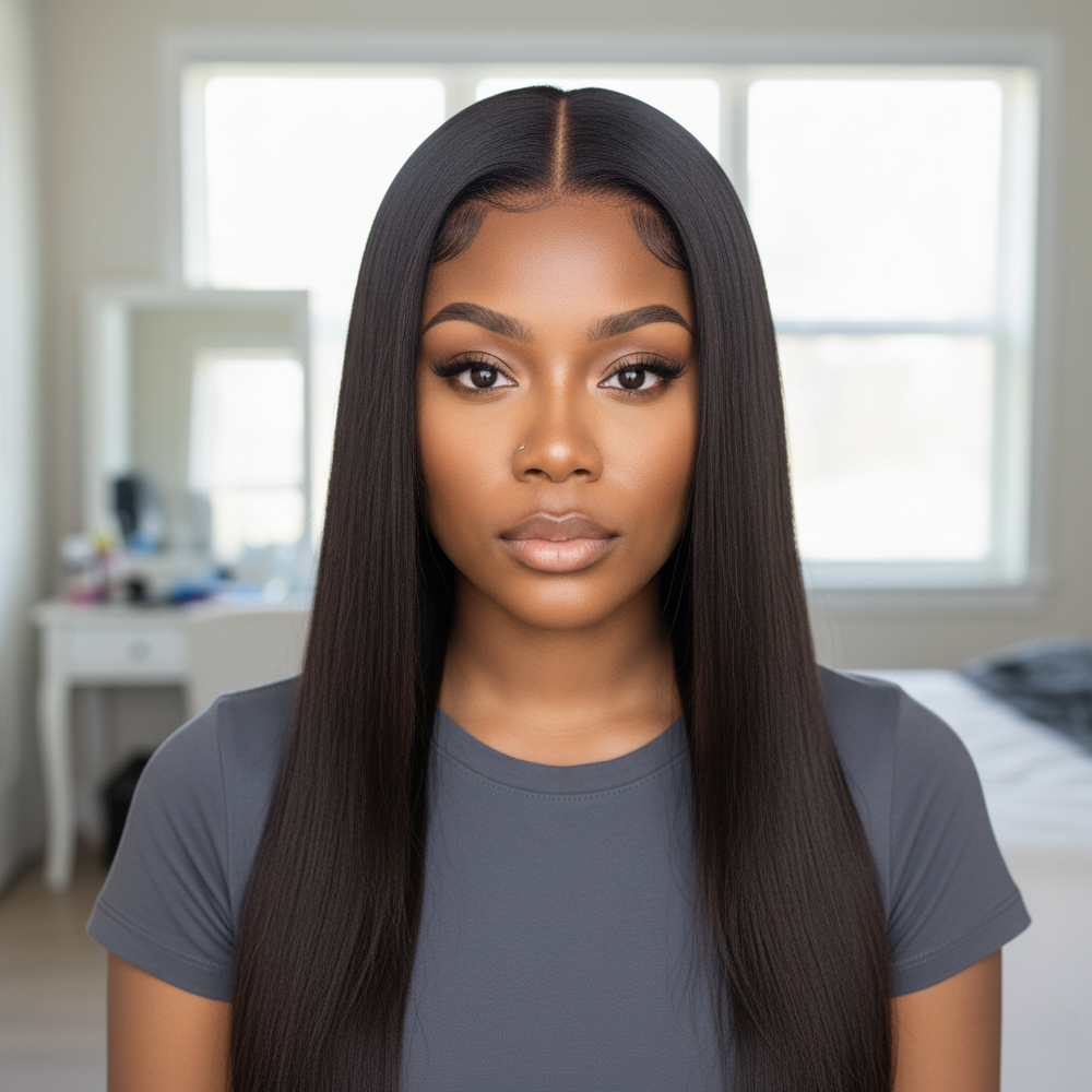 Achieve effortless elegance with this 100% human hair straight wig. Glueless design with adjustable drawstring ensures a perfect fit, while the soft, silky strands let you go from sleek straight to voluminous waves or curls. Natural black color adds depth and shine for a flawless everyday look.